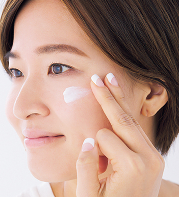 手にとった日焼け止めを少しずつ指にとり、頬から塗りはじめます。その後、額、鼻、あご、細かい部分の順に塗って。