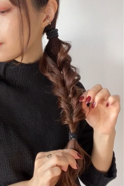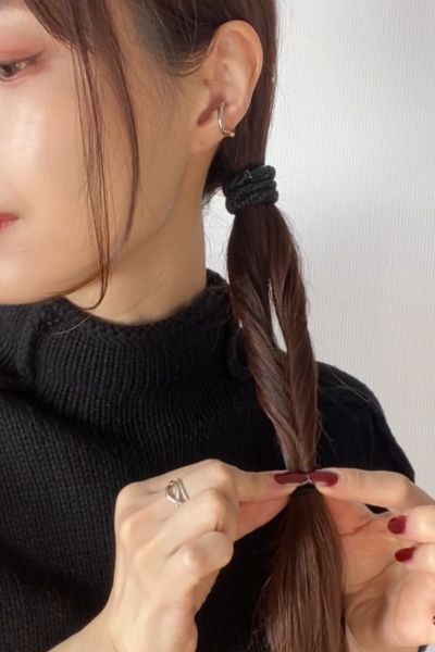 ポニーテールから7〜8cm離れたところをゴムで結ぶ。