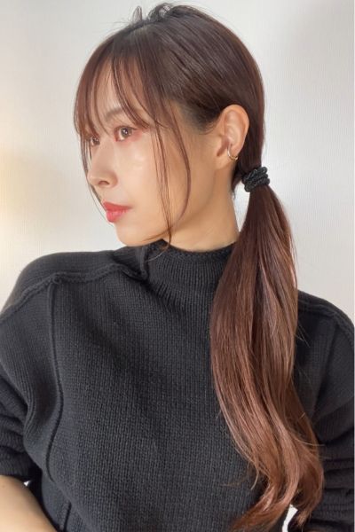 3〜4束、前髪をシースルーで出したダウンスタイル。目にかかる前髪も数束なら野暮ったくならず、むしろこなれ感が。サイドの髪は耳にかけつつ、後れ毛を意識して。