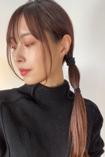 前髪は真ん中のみ数束残し、目にかかる長さでも邪魔にならないようセット。サイドの髪はしっかりめに残しつつ、片方だけ耳にかけてこなれた雰囲気に。あえてかっちりまとめない感じが、リラクシーで今っぽい。