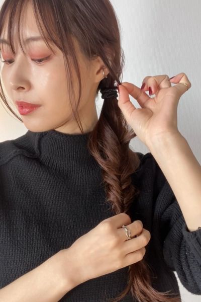 髪でゴムを隠すように覆い、結んだゴムに毛先を入れ込んで固定する。