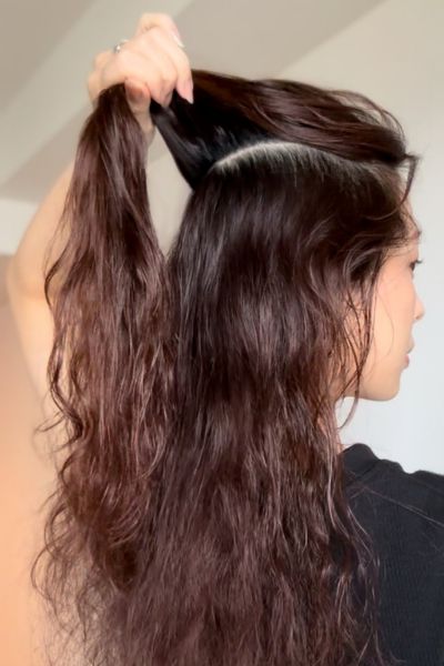 髪を手ぐしでまとめたら、低めの位置でポニーテールを作る。