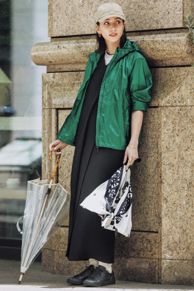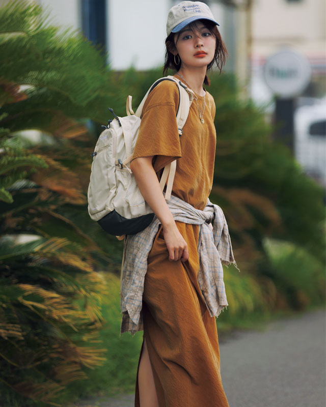 黒ワンピのコーデを肌なじみのいいベージュキャップで抜け感をもたらして。前髪なしスタイルは、横の髪を耳にかけてすっきりさせるとGood!