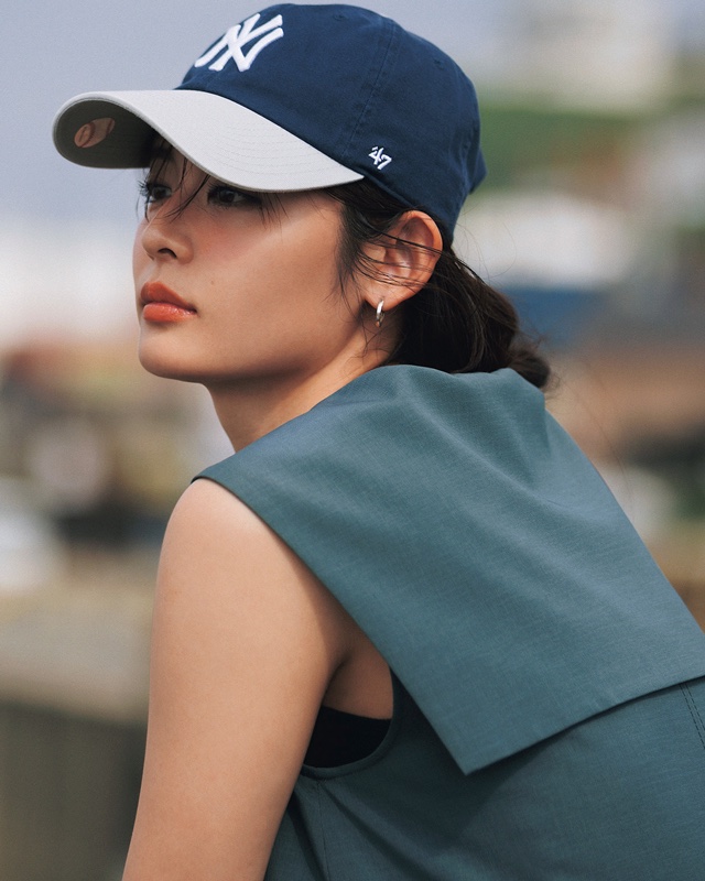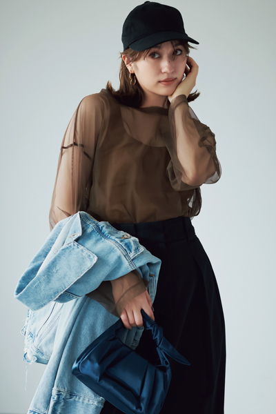 きれいめカジュアルな着こなしの日は、キャップ×ダウンヘアの顔まわりも美しい印象に仕上げたい。前髪なし×耳かけだとカジュアルすぎるというときは、こめかみからの髪の毛をたっぷり耳前に下ろし、フェイスラインがきれいに映るように髪型を作って。