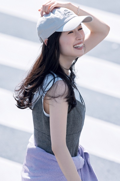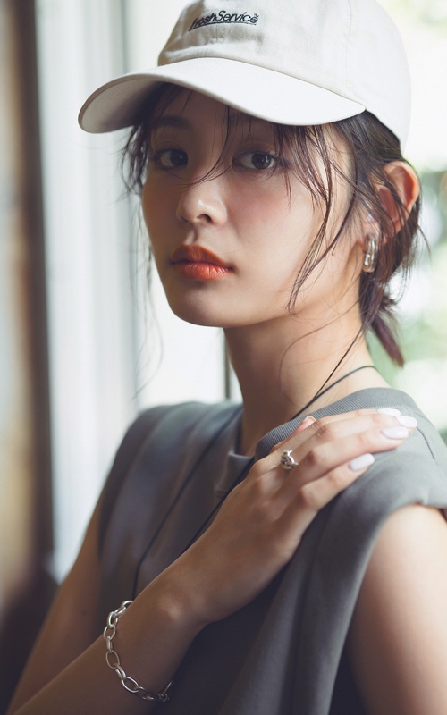 前髪ありの場合は、おでこをどれぐらい見せるかというのがキャップを被る際のポイント。シースルーバングでチラ見せしたり、流しバングでサイドに出したり… ほどよいアクセントとして前髪を演出してみて。