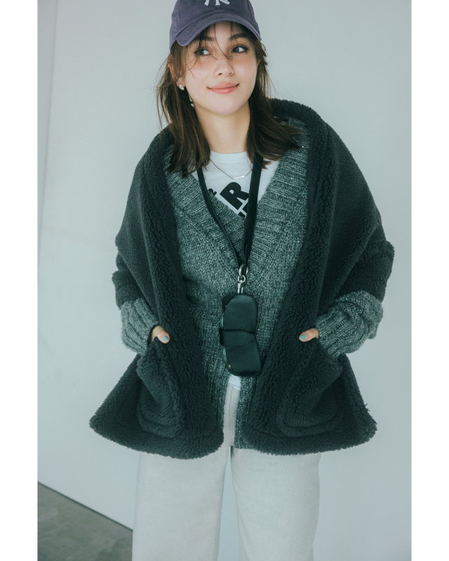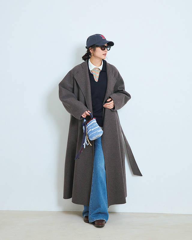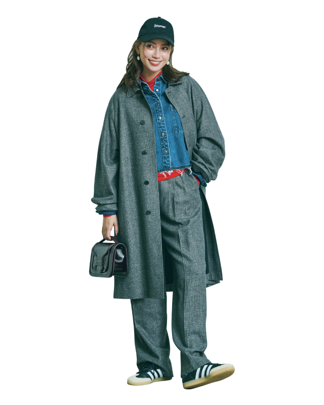 前髪は全部しまい、耳前の後れ毛を残した洒落感たっぷりなスタイル。後ろはまとめ髪ですっきりさせ、キャップは少し深めにかぶってコンパクトに。迫力あるコートを羽織っても好バランスに仕上がる。