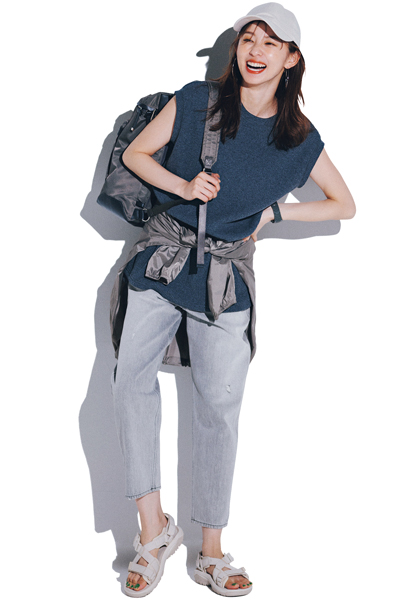 ゆるっとしたカジュアルコーデも、大人女性はヘアスタイルに美しさを忘れたくない。センターパートで肌全体が見えるとアクティブな印象になるので、束感のある前髪を数本出してヘルシーなニュアンスをプラスして。