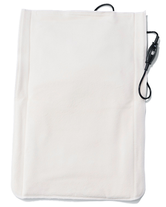 約5分で70℃まで一気に上昇する遠赤放射セラミックシート入りの湿熱器。「冷えやすいおなか、腰、太ももを温めるのに最適! 乾燥せず、しっとり温まるのもうれしい」丸央産業 湿熱アンポ ¥66,000