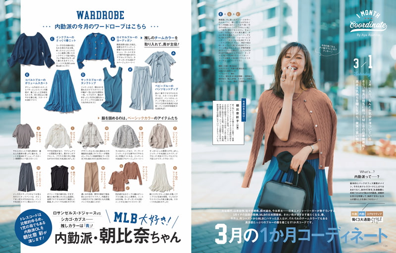 今月は、昨シーズンからMLBにハマった主人公が、それぞれのチームカラーでもある清涼感たっぷりのブルーの服を着こなす1か月コーデです。