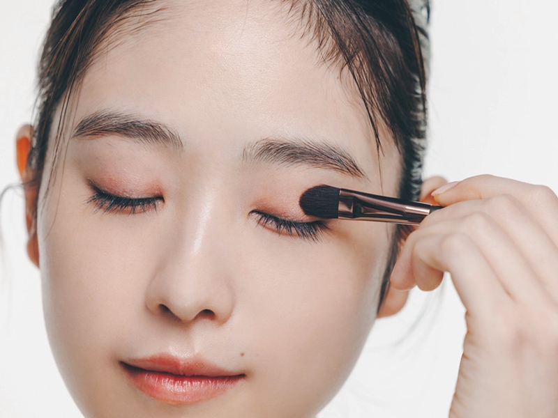 塗るときはまぶた中央にラメなしアイシャドウをのせたら、左右に広げてアイホール全体に。その後、アイシャドウブラシにアイシャドウを足し、二重幅に色を重ねます。これによりのっぺりせず奥行きのある目元に。下まぶたにもほんのり色をのせると、マイルドな囲み目が完成します。