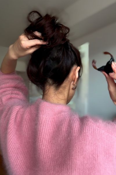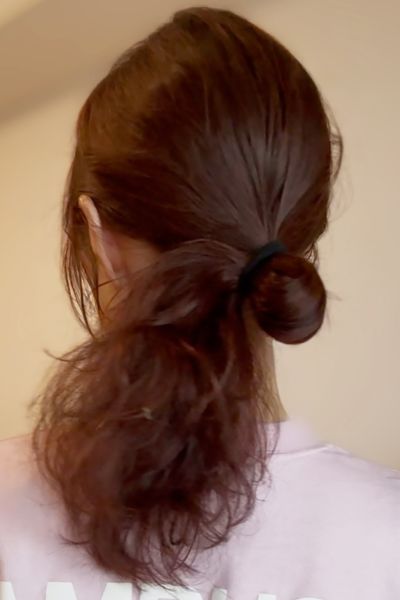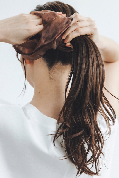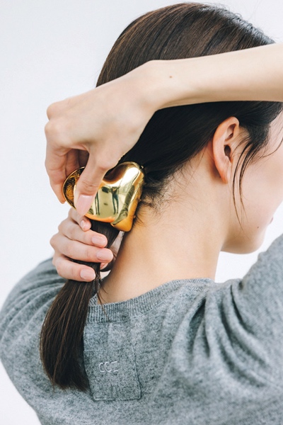 [1]髪全体にバームをなじませ、手ぐしで低い位置にまとめる。まとめた毛束を半分に折り、ゴム1本で全体をまとめるように結び、カチューシャをつける。
