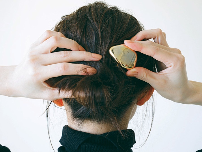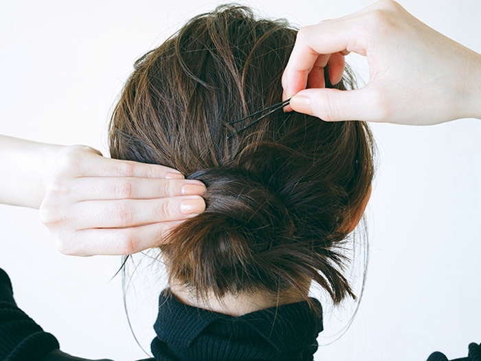 [1]全体にワックスをなじませたら、低い位置に髪をまとめてお団子にする。毛先は結び目に巻きつけ、ヘアピンで固定。