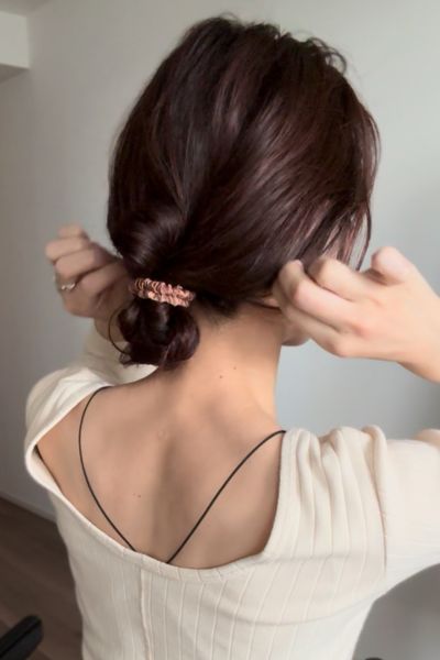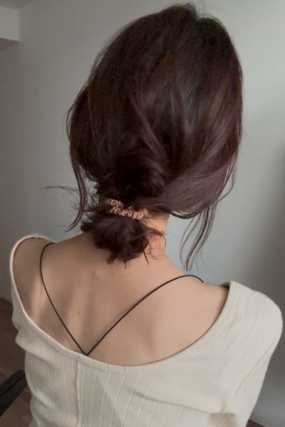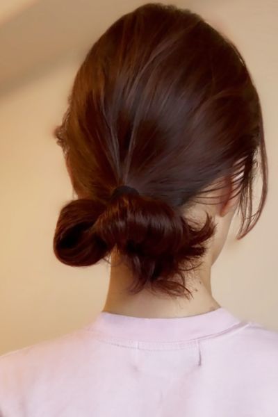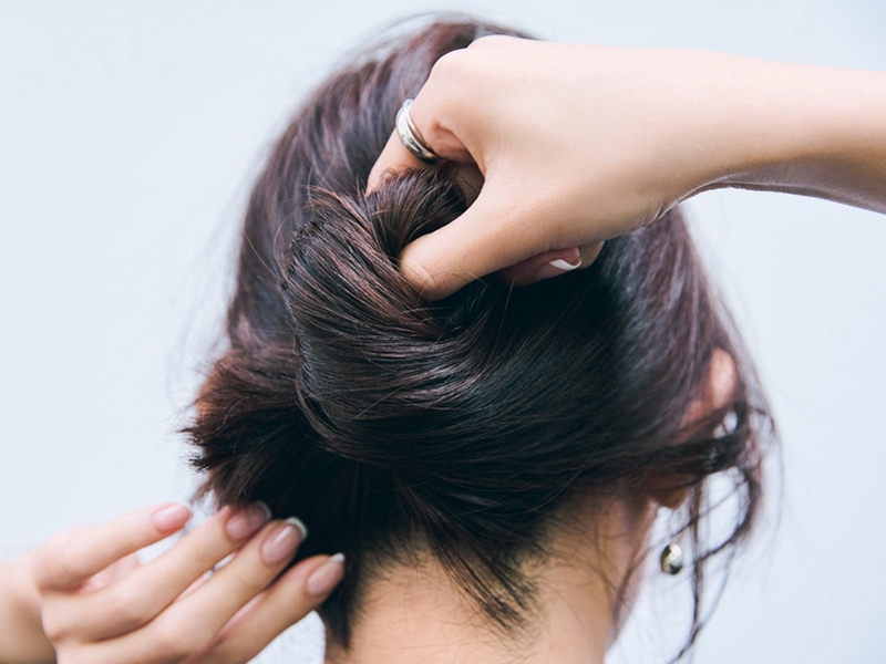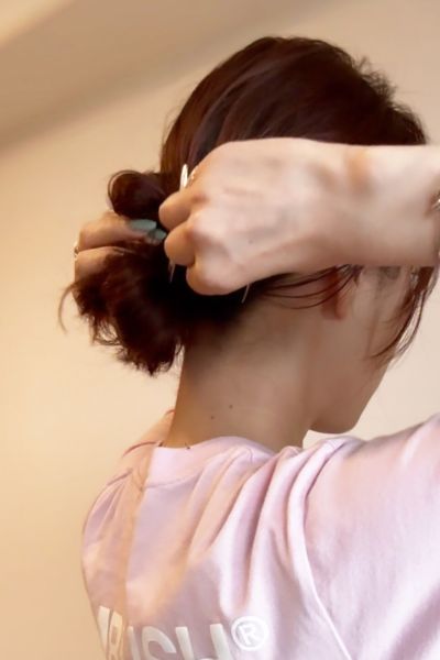 [4]もう1本のゴムでまとめたものをロックするイメージで、お団子風に結ぶ。後頭部を崩したら完成。
