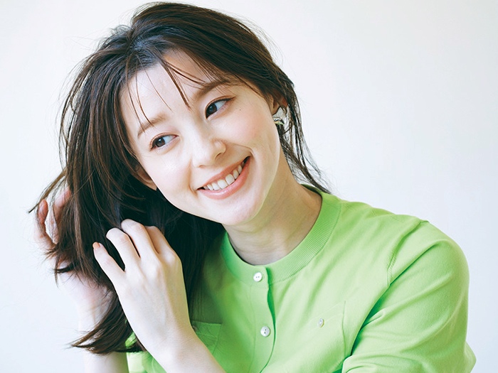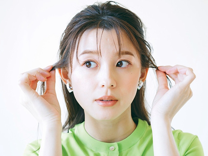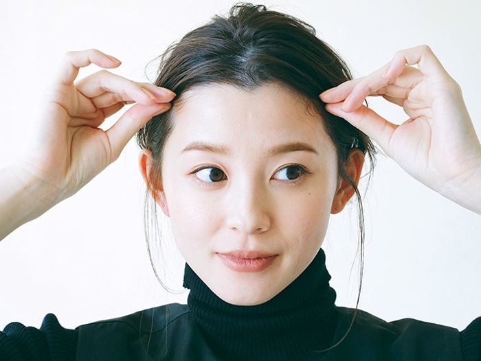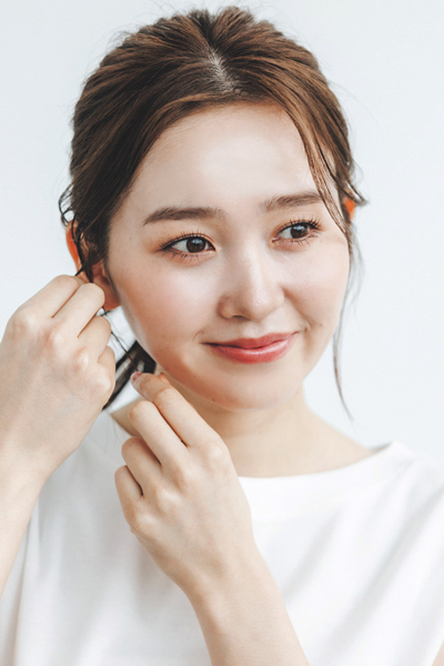 [4]顔まわりの後れ毛やトップを指でつまんで引き出し、全体のバランスを整えて完成!