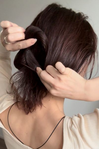[1]バームを全体になじませたら、顔まわりの後れ毛を残し、髪を低い位置でひとつにまとめてねじる。その毛束を輪っかが上にくるようにして、さらにねじ上げる。