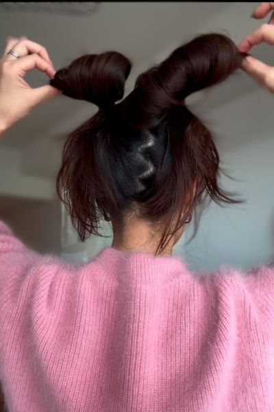 [2]左右それぞれの髪を、耳をつくるイメージで高い位置に結ぶ。