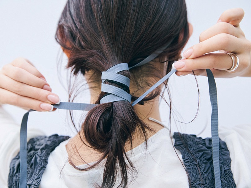 [2]カチューシャのリボンを交差するようにして、毛束の上から下へと巻きつける。リボンの残りは下から上に巻いて、根元でリボン結びして固定。
