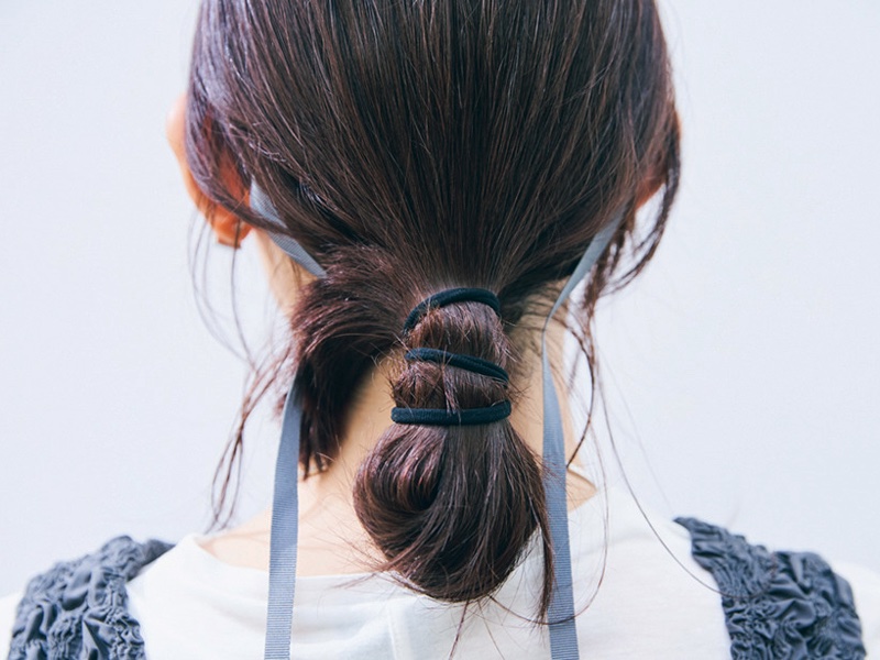 [1]髪にスタイリング剤をなじませたら、シリコンゴムで低い位置にひとつ結びをつくる。