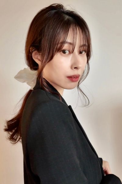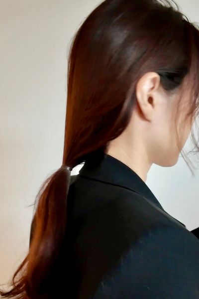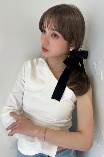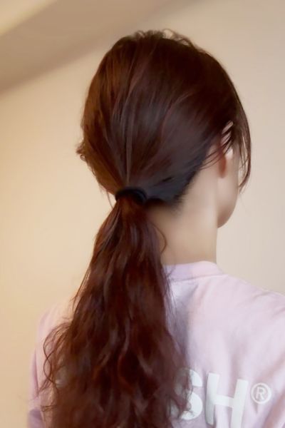 [1]髪全体を低い位置でやや緩めのひとつ結びにする。