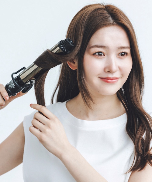 [1]38mmのコテでカールがしっかり出るよう毛先を強めのワンカールにする。