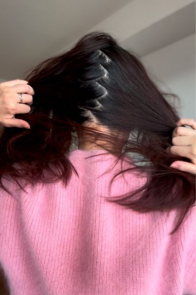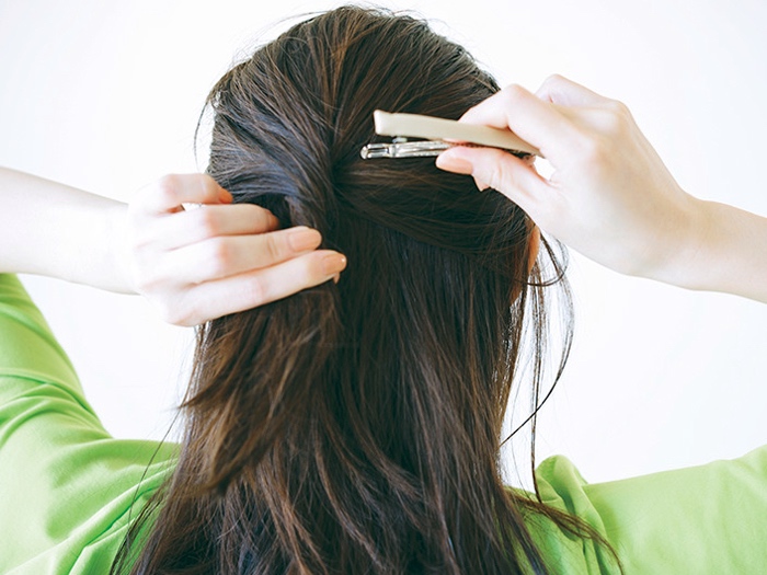 [2]毛束をクリップを使って固定する。毛先はラフに遊ばせて、こなれ感を出す。