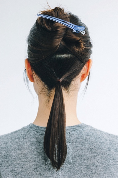 [2]トップの髪を下ろし、最初につくったゴムの結び目の上でまとめ、クリップで留める。
