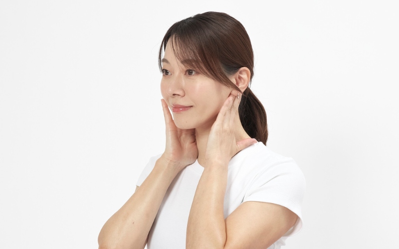 STEP 1:手の指先をあご先に添えて、耳の後ろに向けてさする。