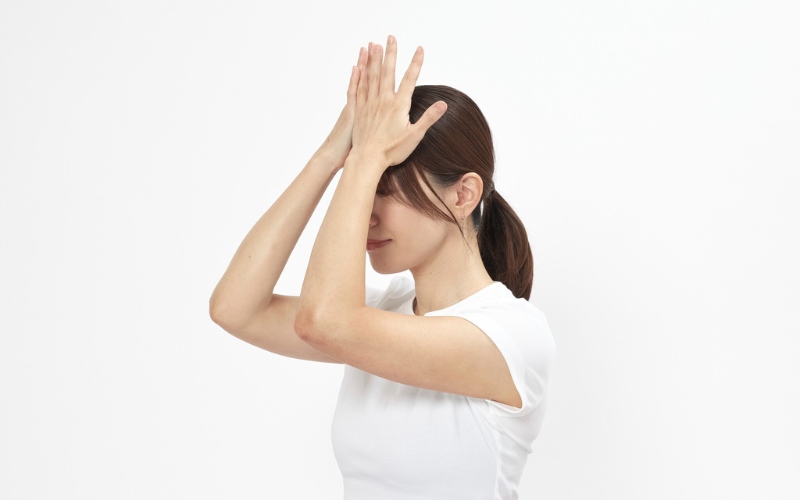 STEP 1:両手を額に添えたら、頭を前から押す。
