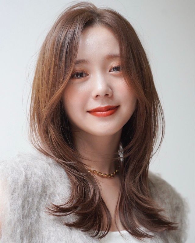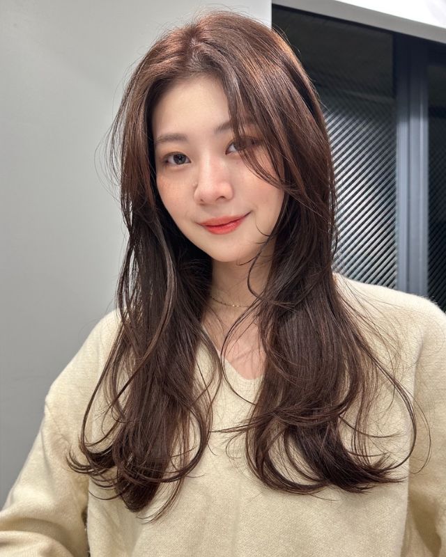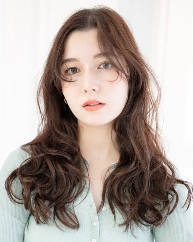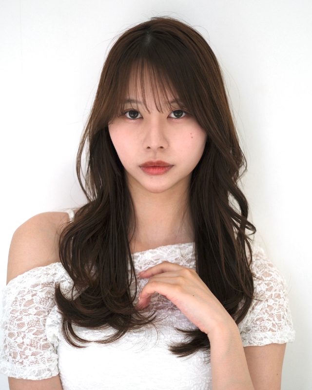 春っぽい抜け感バングを合わせたロングスタイルを紹介します。顔周りを中心にレイヤーをしっかり入れるのがポイント。特に、フェイスレイヤーは顔の骨格に沿うように入れているため、さらっと巻くだけでもサマになり、小顔効果も望めます。