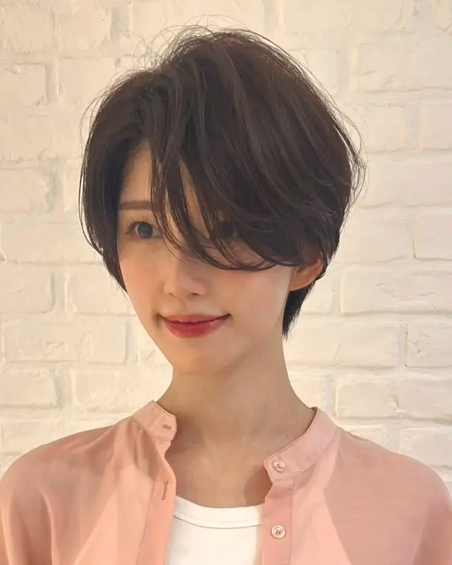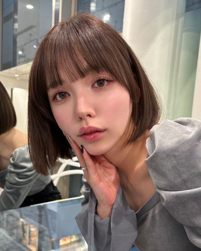 カットベースは肩にあたる長さで前上がりに切り、顔周りにレイヤーをオン。顔周りがデザインの鍵なので、骨格に合わせてバランスを整えます。前髪は少し長めに目の下でカット。