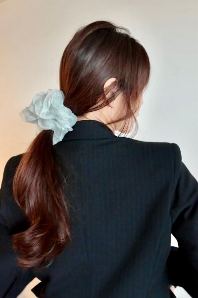 かっちりとした羽織りものに合わせるのは甘め印象のビッグシュシュ。シュシュのふわっとした素材感が女性らしさや柔らかさを添えて、大人の甘辛バランスに仕上がります。シンプルにシュシュを結ぶだけではなく、ちょっとしたコツがあるので作り方をぜひチェックしてみて。シュシュを使ったポニーのコツと顔周りの作り方を紹介します。
