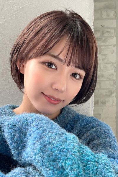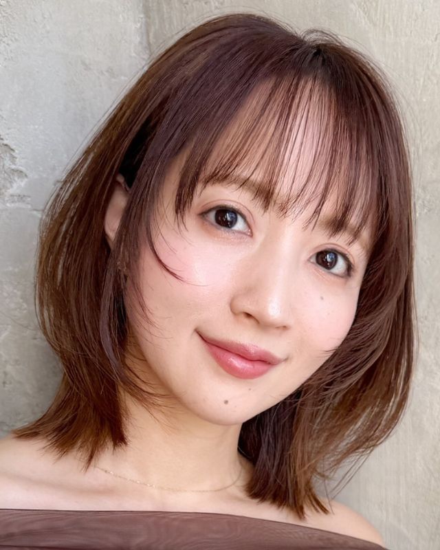 カットはベースを胸上5cmで前上がりに切り、顔周りにたっぷりレイヤーを入れます。前髪は長めのシースルーにカット。前髪ありは幼く見えやすいため、大人っぽく流せるよう調整します。