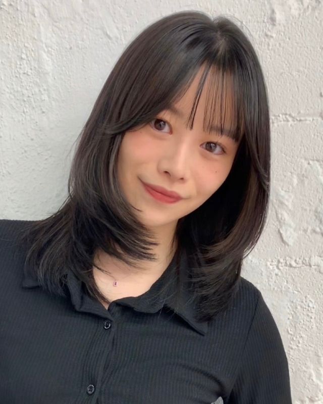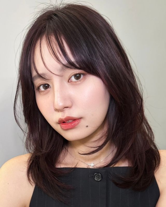ベースは鎖骨下のミディアム。リップラインから内に入るようにレイヤーを入れ、表面にもレイヤーを加えてシルエットを調整します。前髪は黒目と黒目の間で薄めに作り、両端はサイドバングへつなげて。