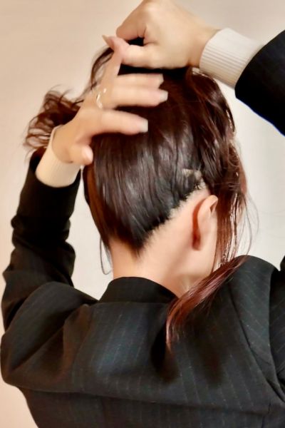 イメージとしては夜会巻きのように後頭部にボリームを出せるのが理想。ただ、ボリュームを出したい部分にクリップを留めてしまうため、クリップより上の部分をボリュームアップさせます。ふっくらボリューム感が出せると骨格補整も望めてバランスがよくなり、お洒落感もUP。