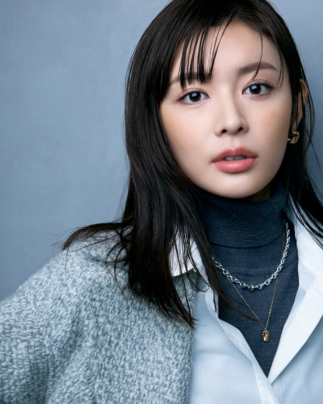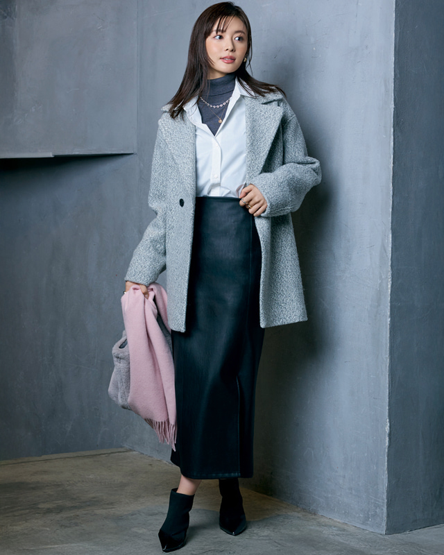 〝アバハウス マヴィ〟のコート¥20,350・シャツ¥8,250・スカート¥10,450・〝ロウェル シングス〟のバッグ¥9,900(アバハウスインターナショナル オンラインストア) ニット¥11,000(DAY by DAY It’s international) 靴¥53,900(フィルム〈ダブルスタンダードクロージング〉) 手に持ったストール¥14,300(アンタイトル) ピアス¥39,600・ネックレス[短]¥70,400・リング[左手人差し指]¥28,600・[左手中指]¥33,000(ブランイリス トーキョー〈ブランイリス〉) ネックレス[長]¥74,800(ココシュニック)