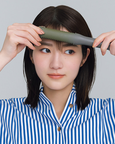 コテに使い慣れていない方は、ストレートアイロンがGOOD。前髪をコームでとかし、温めたアイロンで毛束の中間を挟んだら、流したい方向へすべらせるようにして手首をまわし、カールさせます。