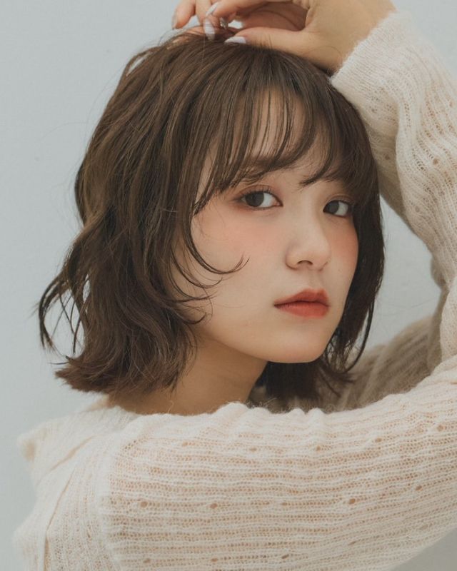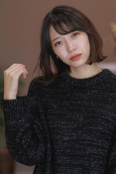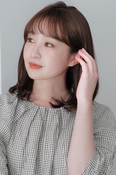きちんと見えもかわいらしさも兼ね備えたスタイル。ベースは鎖骨ライン、表面にレイヤーを入れています。中間〜毛先を毛量調整し、軽やかさをプラスしましょう。前髪は眉下で平行にカットし、両サイドをやや長めに残してサイドへと繋がりやすくしています。