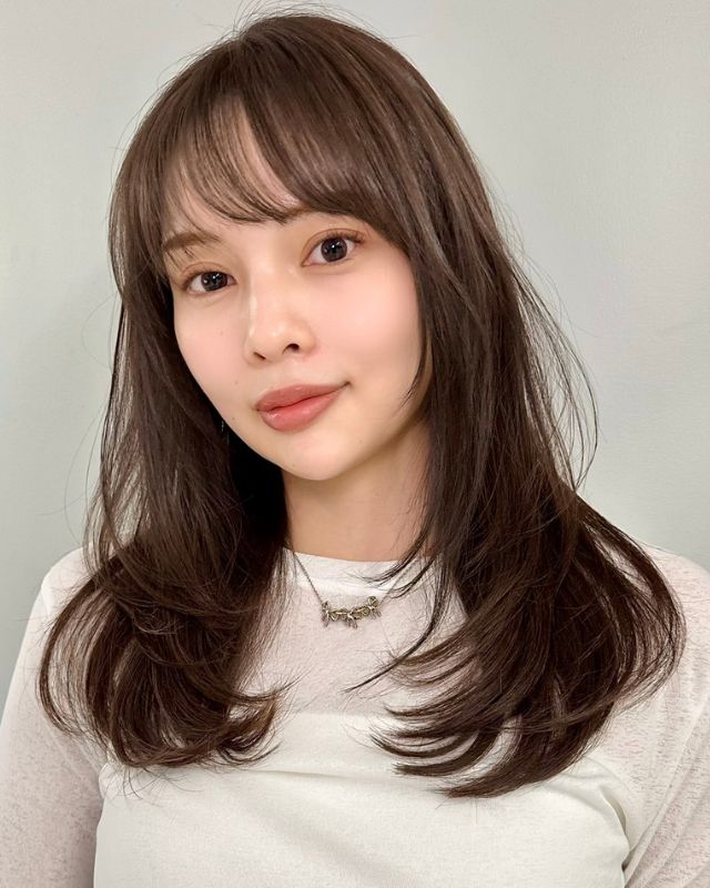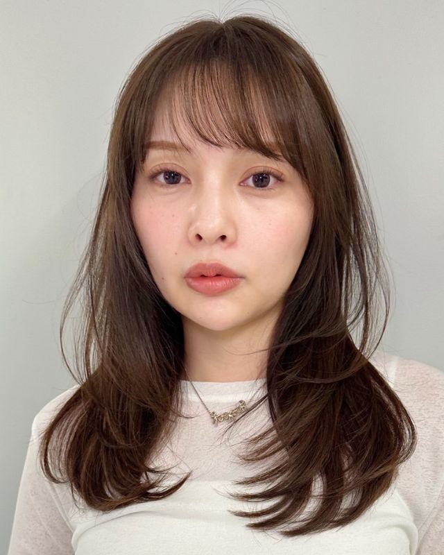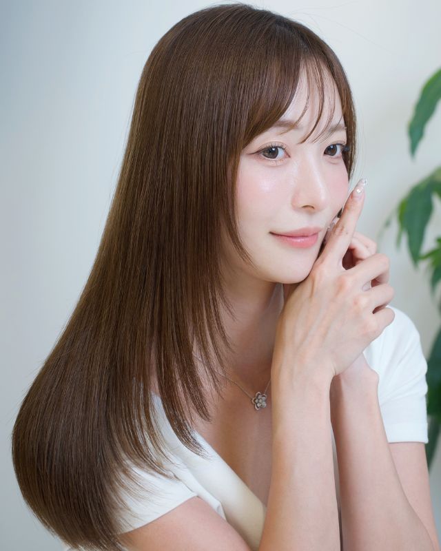 ツヤやかなストレートロングが好印象な髪型。ベースは胸上5cm、レイヤーを顔まわりにたっぷり入れています。前髪は長めのシースルーにカットし、大人っぽく流せるよう調整して。