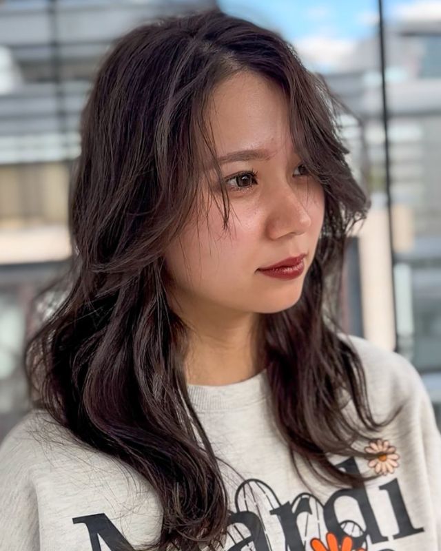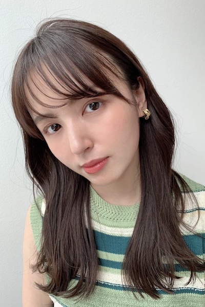 カットは鎖骨下でベースを作り、全体に低めにレイヤーを入れ、重さを残しつつ軽やかな仕上がりに。前髪は薄く目にかかる長さでカットします。