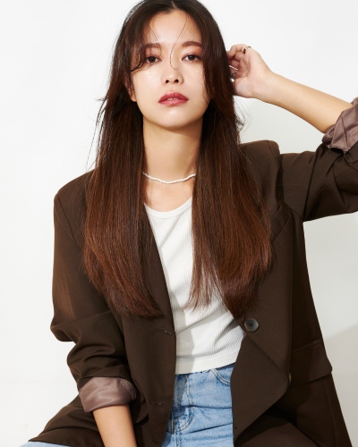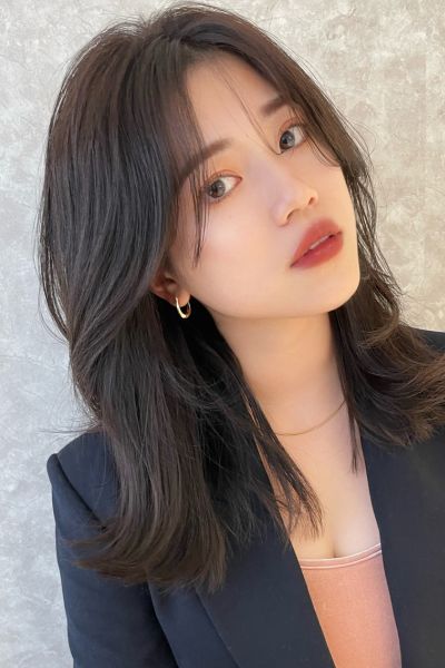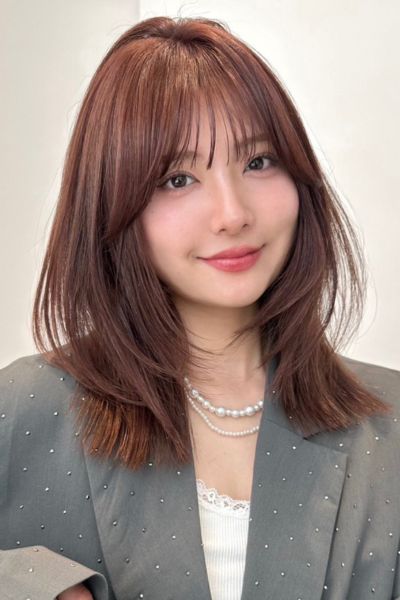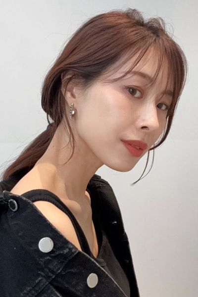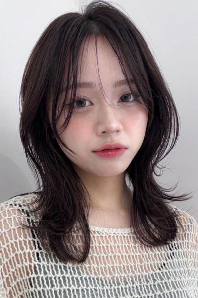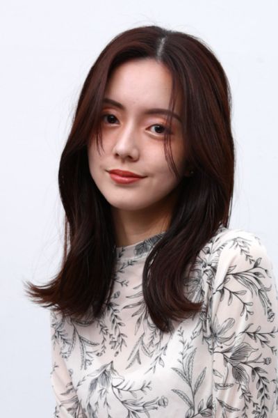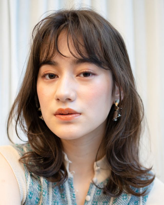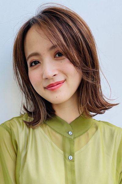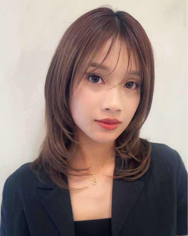 スタイルは鎖骨下のミディアムべース。やや長めに作った前髪は、流しやすいように少し段差をつけてカットます。顔周りを中心に顎下からレイヤーを加え、シャープな毛流れに。まろみのあるカラーとのバランスがちょうどいい。