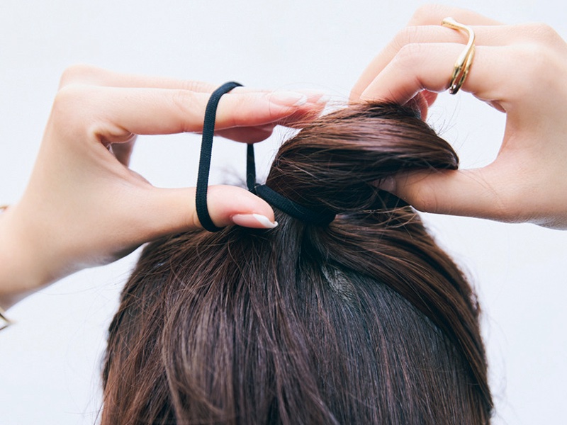 もう1本のゴムでまとめたものをロックするイメージで結びます。ラフ感を出す前の完成がこちら! 今回、細めのシュシュを使いましたが、飾り付きのゴムなどお好みのアイテムで雰囲気を変えてもOKです。