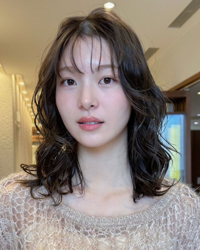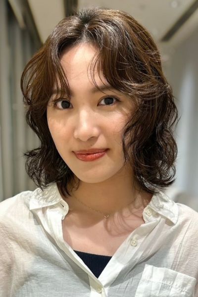 こちらのミディは、カジュアルでも大人っぽいこなれ感が出ます。ローレイヤーを入れ、トリートメント効果のあるパーマをかけているので、ツヤやかで大きめのしっかりとしたカール感を実現。エアリー感とベースの重さで重軽MIXを演出し、動きのある顔周りの髪が骨格カバーを叶えます。