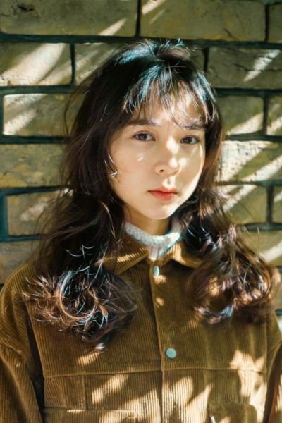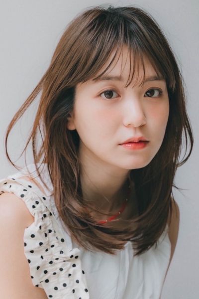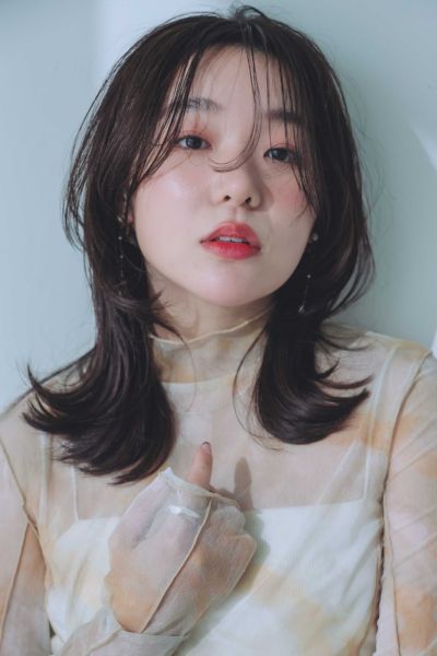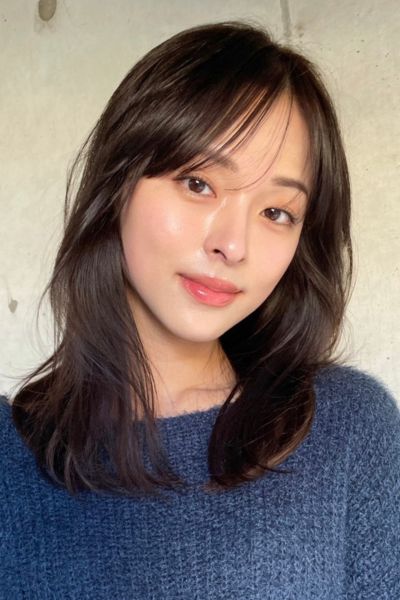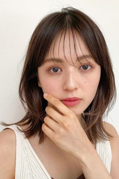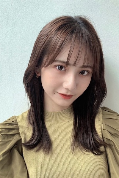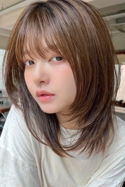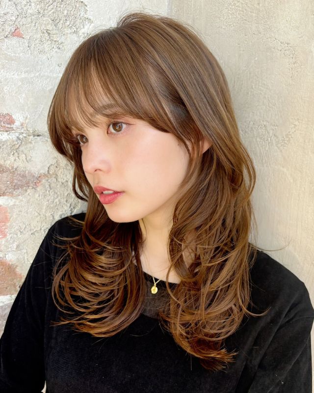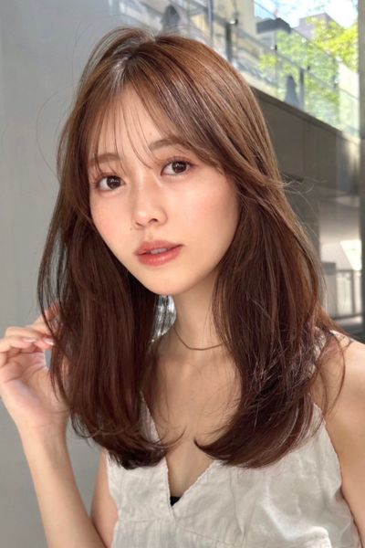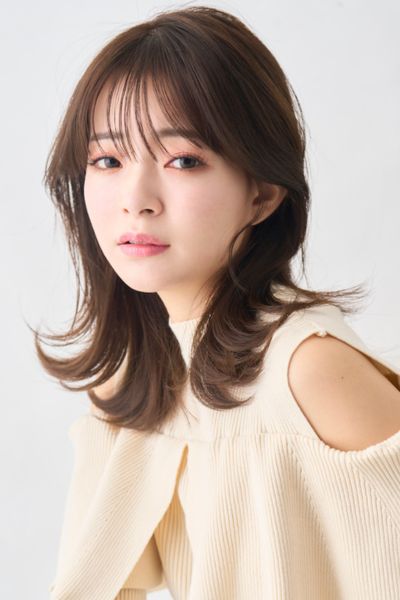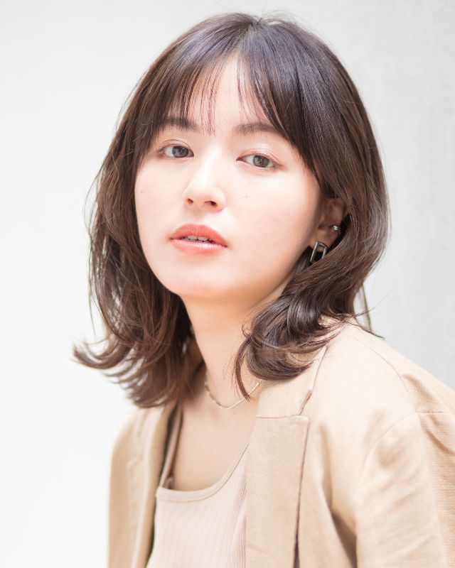 柔らかい動きが印象的なミディアムレイヤー。前髪ありでも長めのワイドバングにすることで可愛くなりすぎず、大人印象のカジュアルヘアを楽しむことができます。ベースを前上がりにしているので、軽い動きの表情が作れまとまり感も満点。明るめのベージュカラーと相乗効果で柔らか印象もUPします。