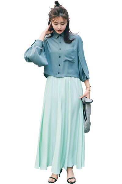 ニュアンス豊かな色合わせのスカートスタイルに、ゴールド&シルバーのメタル付きゴムで飾ったダブルのちび団子。甘さと辛さ、エレガントとラフ、相反するムードをミックスすることで、お洒落の予定調和感を回避してフレッシュに!