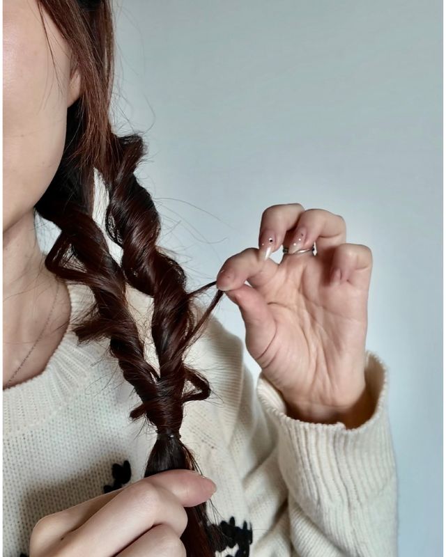 巻かずにできる時短&テクニック要らずで簡単なのはもちろん、毛先をくるくるっとまとめてしまうのでボサボサ部分がカバーできて健康的な美髪に見せられるのもポイント。使うゴムは2本です。細めのシリコンゴムと太めのゴム(シュシュでもOK)を用意。