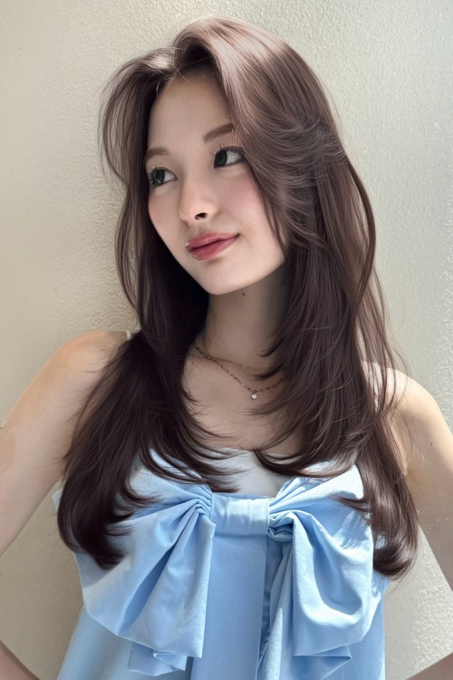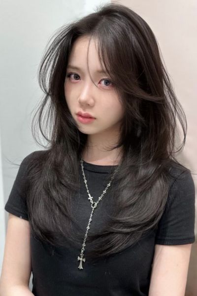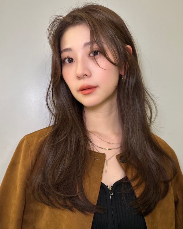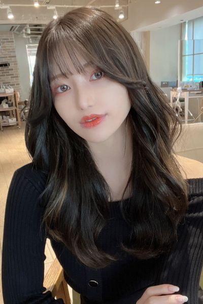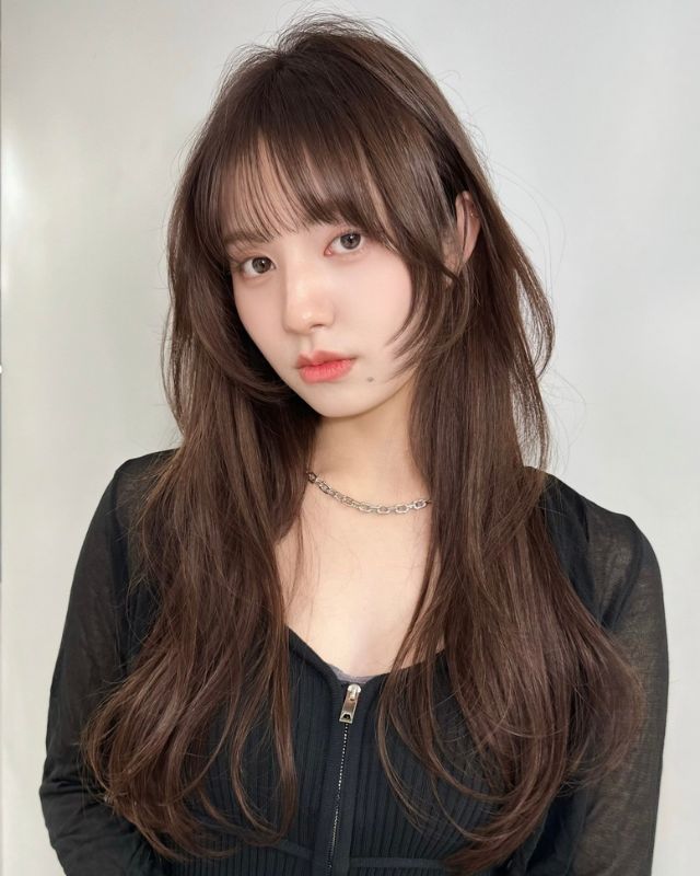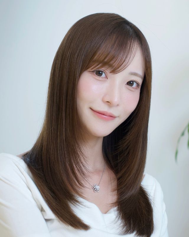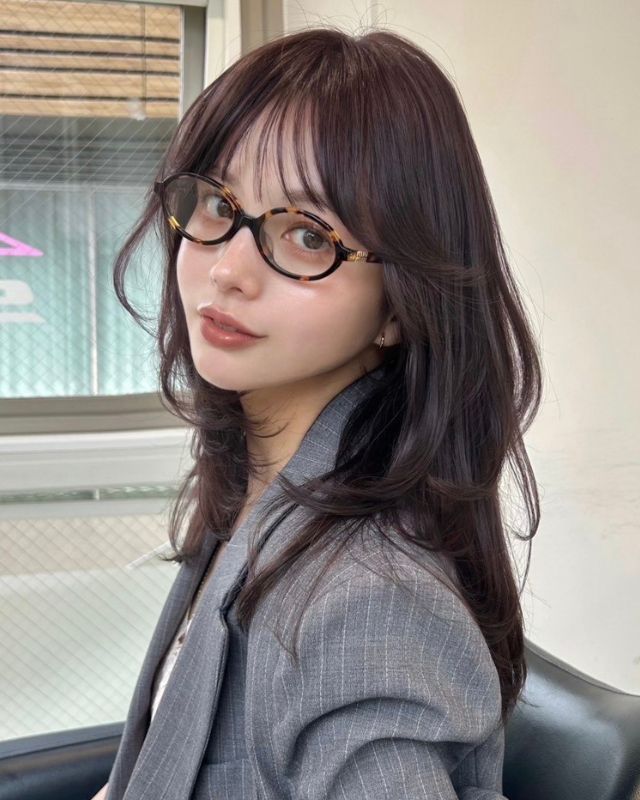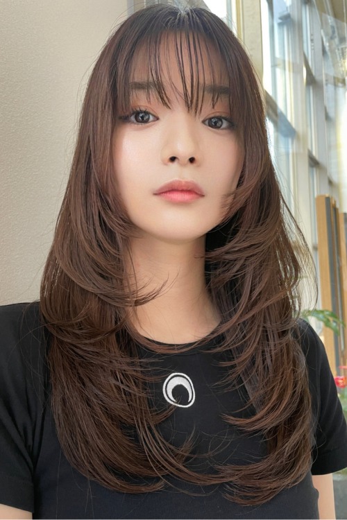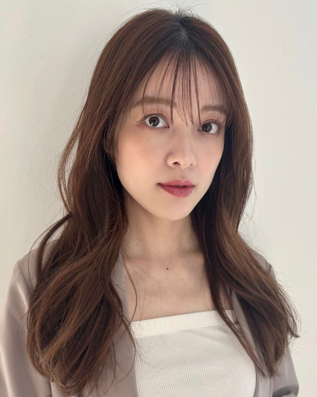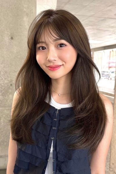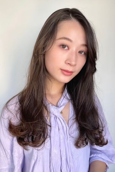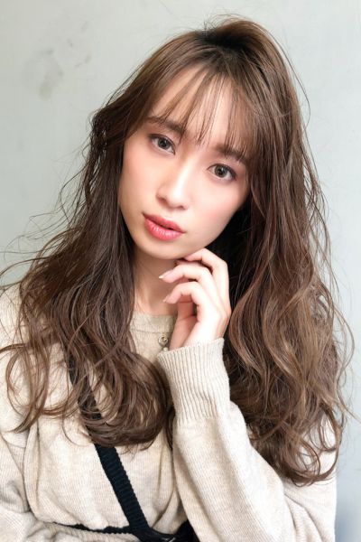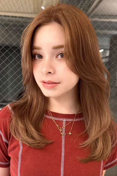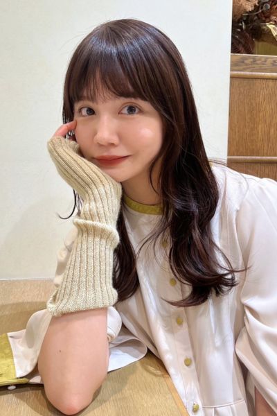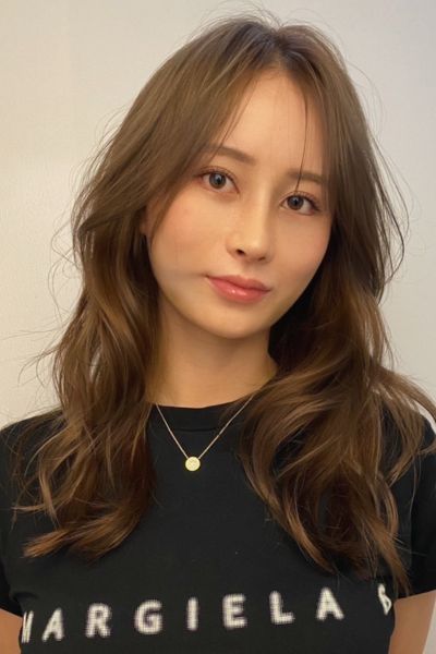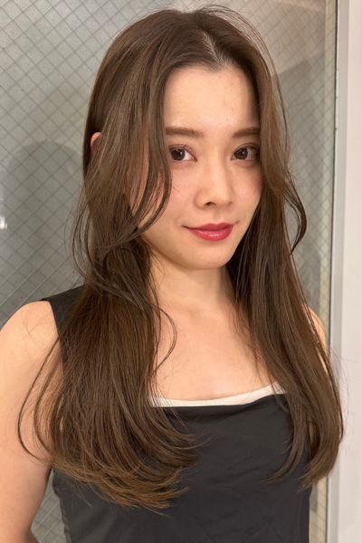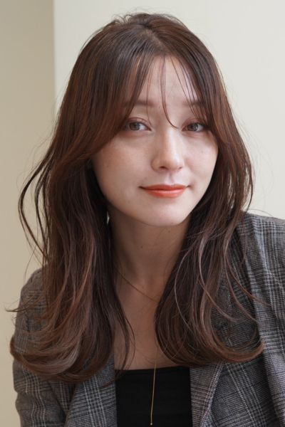 ベースはバストラインの長さのロング。前髪は目元あたりで適度な重さを残しつつ、レイヤーでサイドへつなげて。全体にはあご下からレイヤーを入れ、毛先は軽く。