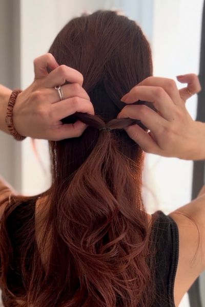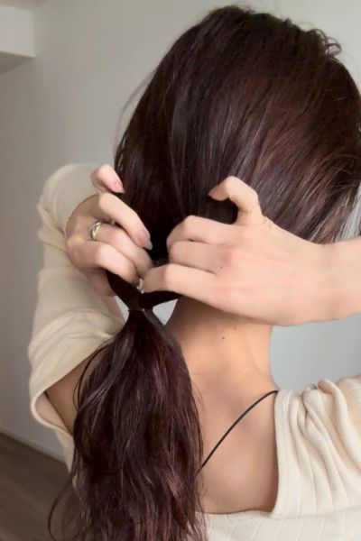 結んだゴムを5〜8cmほど下にずらし、くるりんぱの要領で髪をふたつに割り、下から髪を引き出します。今っぽくレイヤーがたっぷり入っている人は、顔周りの髪が落ちてこないようにゴムの下げ過ぎに注意して。