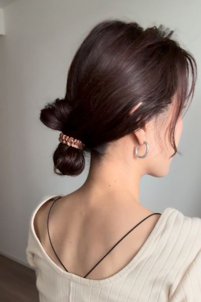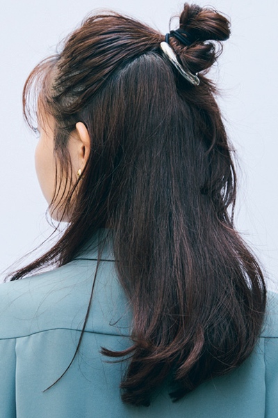 小さなお団子がふたつ、さりげなく並ぶハーフアップアレンジです。顔周りのニュアンスはあるのに、全部おろすより格段に涼しくて横顔も後ろ姿もチャーミング、といいことずくめ。メタル付きゴムで「大人っぽく引き締める」のがポイントです。