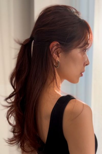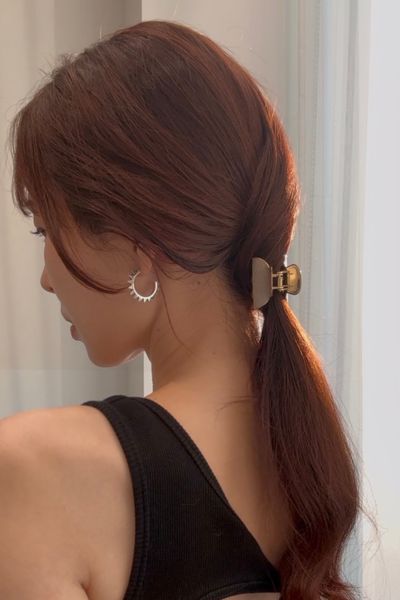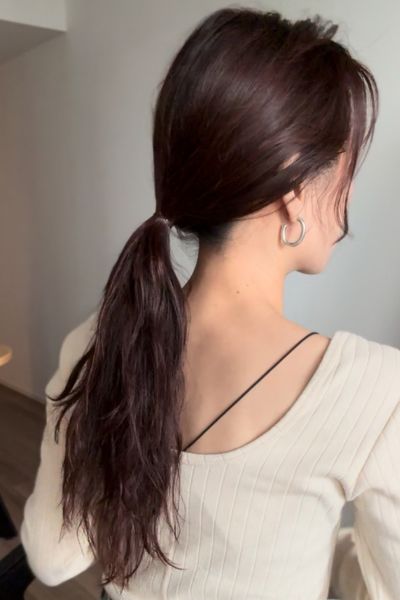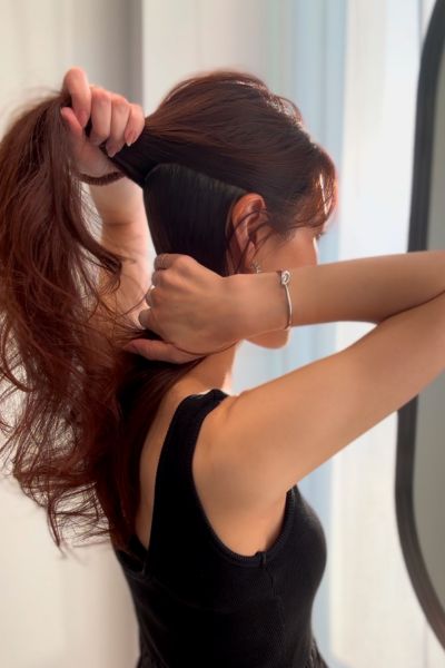 髪にスタイリング剤をなじませてからシリコンゴムを使い、低めの位置でひとつ結びに。スタイリング剤を塗布するメリットは、まとめやすくしつつ保湿ができる点です。また、アイロンなどで巻かずにできるのも◎。