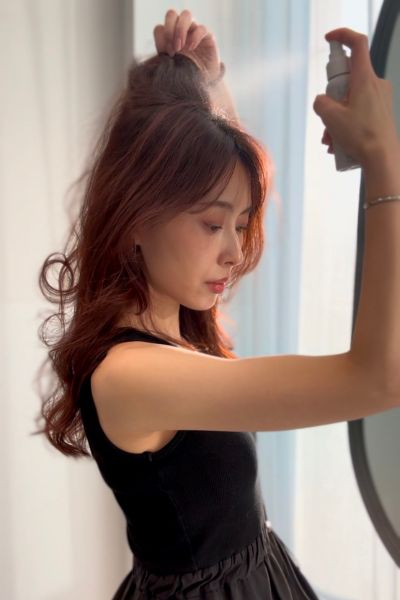 ミストタイプのスタイリング剤を全体に吹きかける。髪にざっくりした質感を作ることで、クリップの引っ掛かりがよくなる。